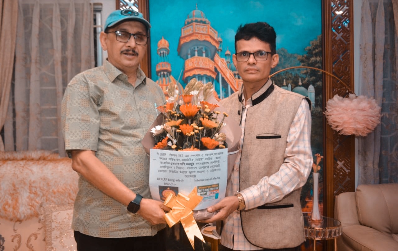 সাংবাদিক ওসমান গণি মনসুর কে ফুলেল শুভেচছা জানান লন্ডন প্রবাসী সাংবাদিক মুনীর চৌধুরী