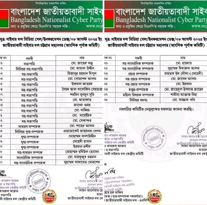২৮ সদস্য বিশিষ্ট জাতীয়তাবাদী সাইবার দল চট্টগ্রাম মহানগর’র আংশিক কমিটি গঠিত