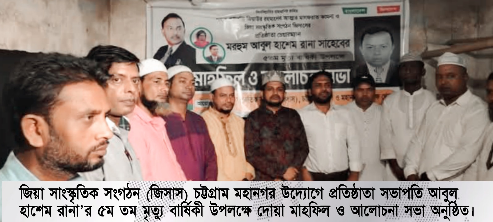 জিয়া সাংস্কৃতিক সংগঠন (জিসাস) চট্টগ্রাম মহানগর উদ্যোগে প্রতিষ্ঠাতা সভাপতি আবুল হাশেম রানা’র ৫ম তম মৃত্যু বার্ষিকী উপলক্ষে দোয়া মাহফিল ও আলোচনা সভা অনুষ্ঠিত