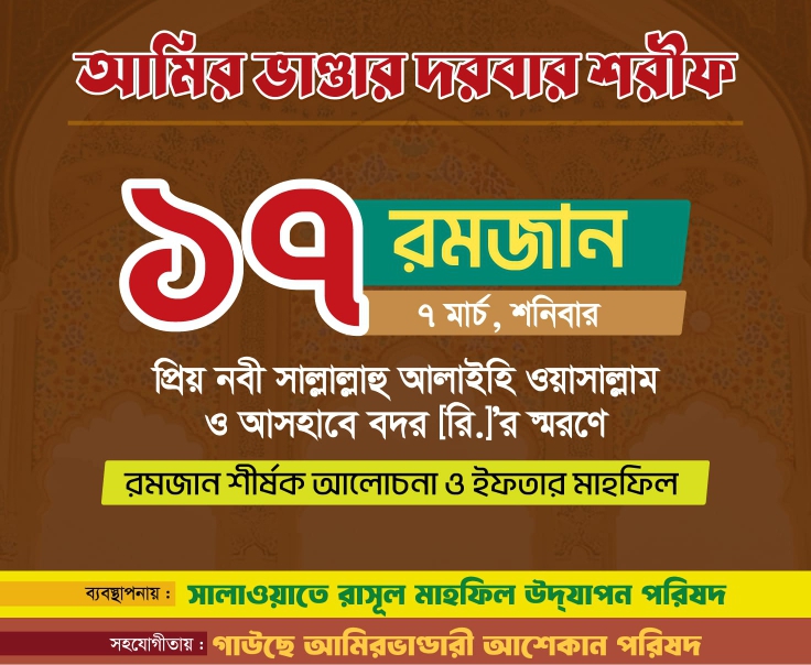 পবিত্র মাহে রমজান উপলক্ষে আমির ভান্ডার দরবার শরীফে আগামী ১৭ই রমজান, ৭ই মার্চ (শনিবার) ধর্মীয় ভাবগাম্ভীর্যের মধ্য দিয়ে এক আলোচনা