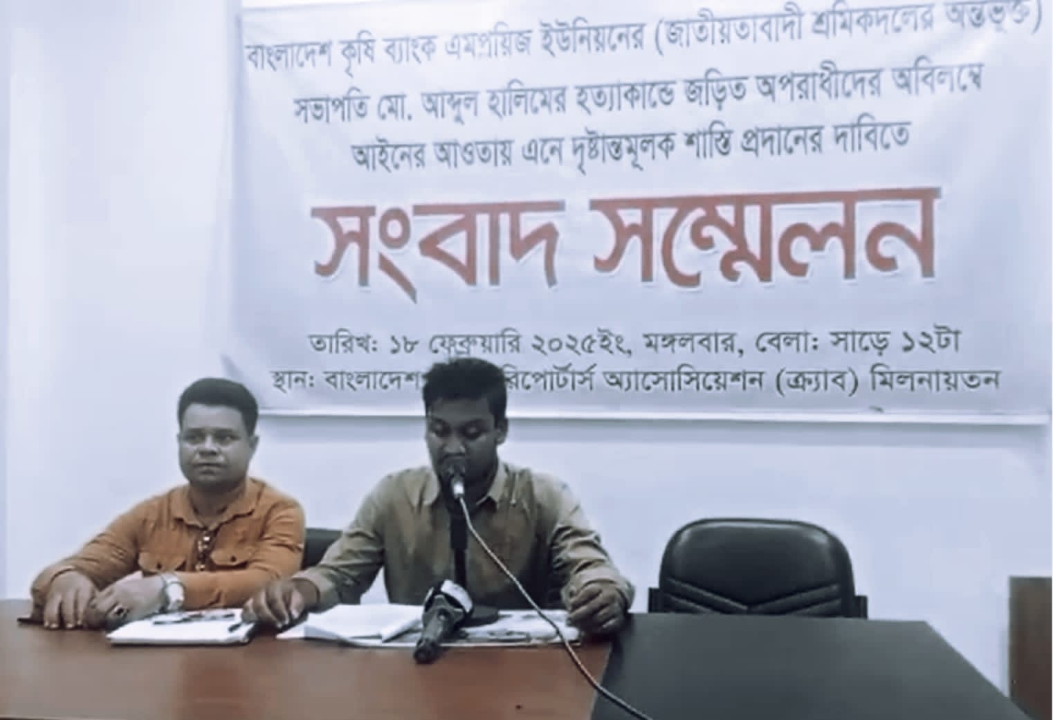 বাংলাদেশ কৃষি ব্যাংক এমপ্লয়িজ ইউনিয়নের (জাতীয়তাবাদী শ্রমিক দলের অন্তর্ভুক্ত) সভাপতি মো. আব্দুল হালিমের হত্যাকান্ডে জড়িতদের অবিলম্বে গ্রেপ্তার ও দৃষ্টান্তমূলক শাস্তির