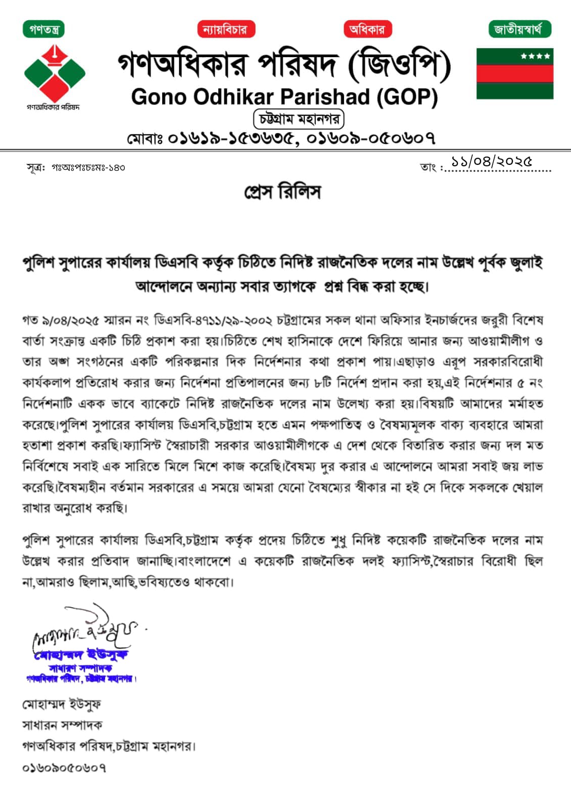 গত ৯/০৪/২০২৫ স্মারন নং ডিএসবি-৪৭১১/২৯-২০০২ চট্টগ্রামের সকল থানা অফিসার ইনচার্জদের জরুরী বিশেষ বার্তা সংক্রান্ত একটি চিঠি প্রকাশ করা হয়।চিঠিতে শেখ