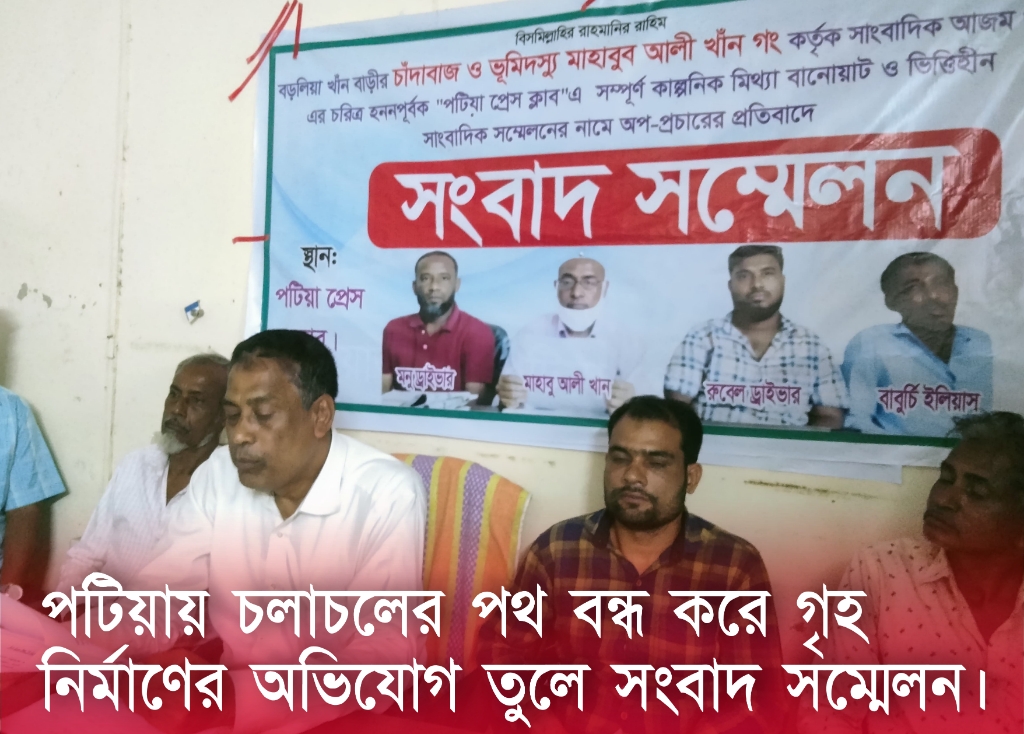 সংবাদ সম্মেলনে অভিযোগ পটিয়ায় চলাচল পথ বন্ধ করে গৃহ নির্মাণ করছে প্রতিবেশী চট্টগ্রামের পটিয়া বড়লিয়ার খাঁন বাড়ীর লোকজনের চলাচল পথ